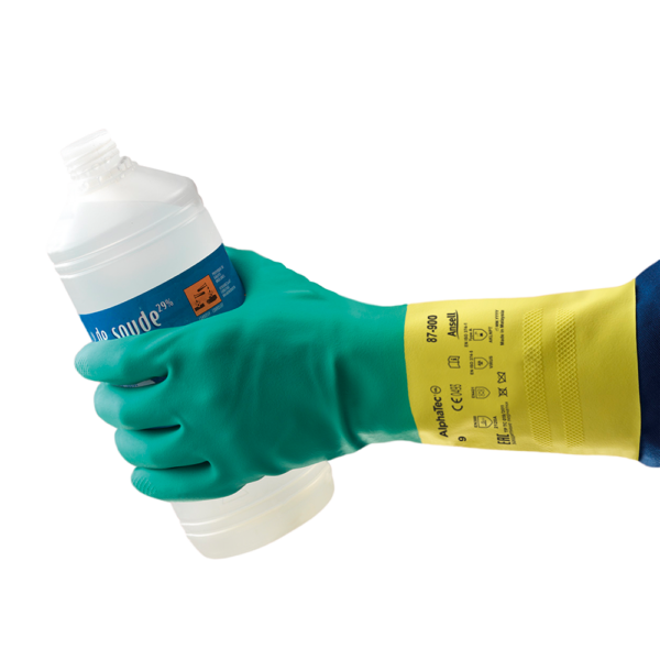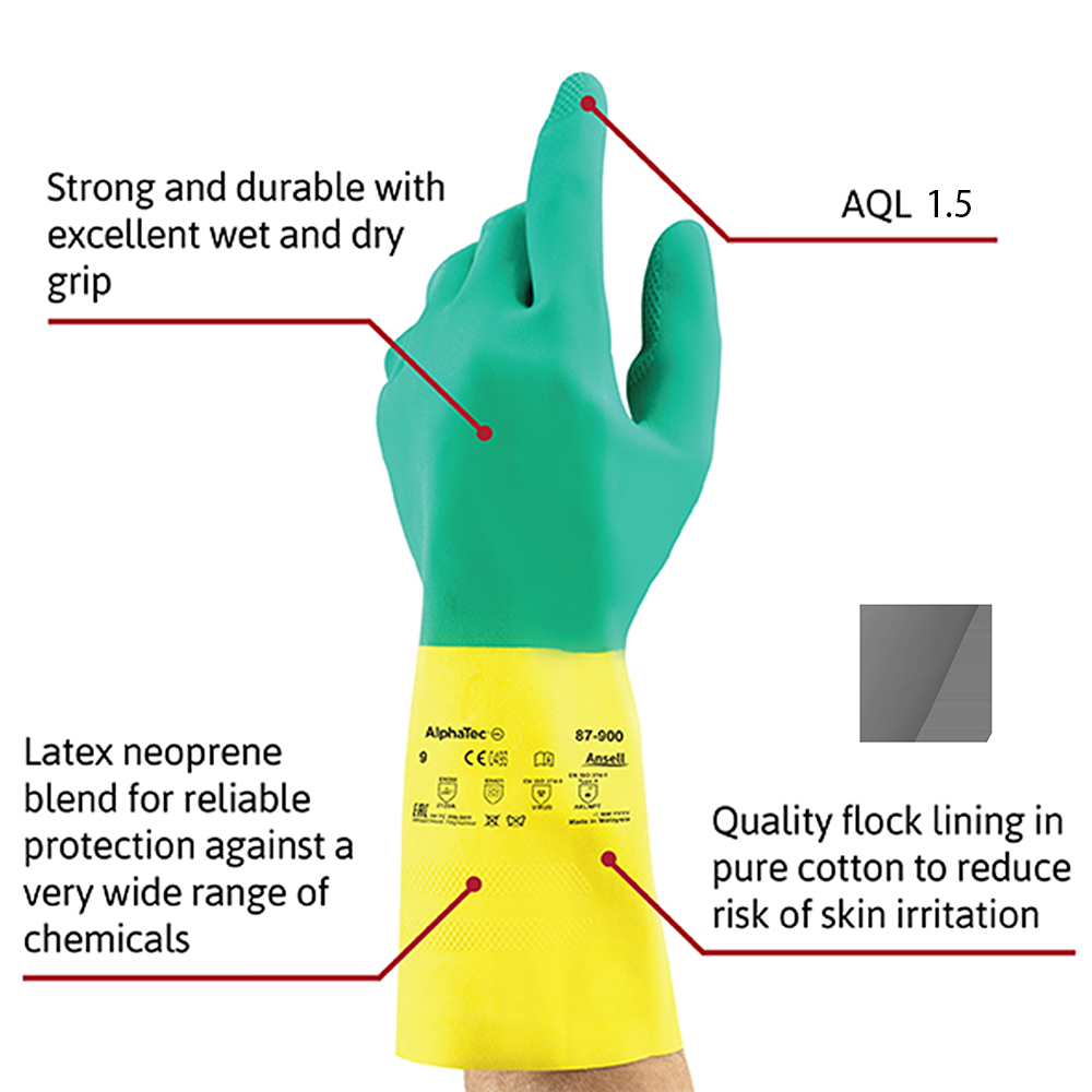 Ansell 87-900 chemical resistant latex and neoprene gloves provide heavyweight protection against a wide range of hazardous chemicals and durable comfort with the following features: