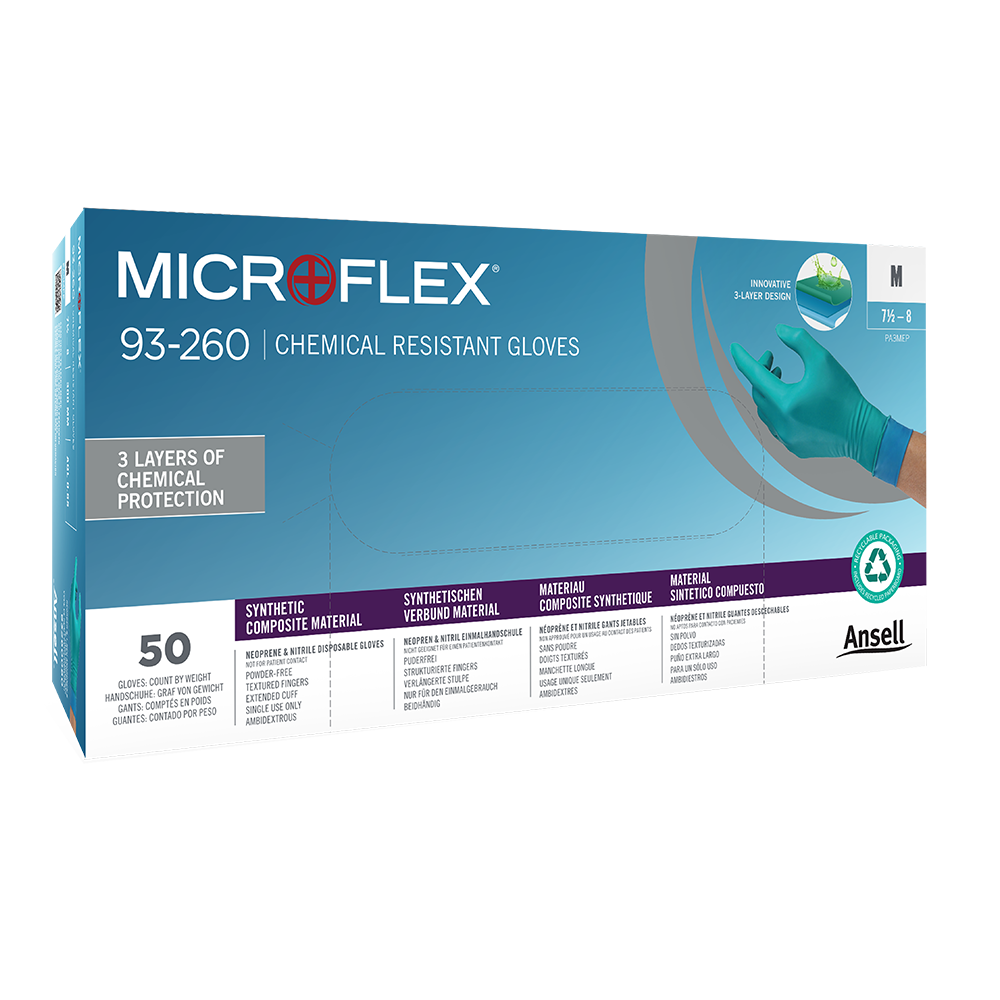 Ansell Microflex 93-260 disposable 3-layer high risk chemical gloves for chemical, automotive, and industrial primary industries.