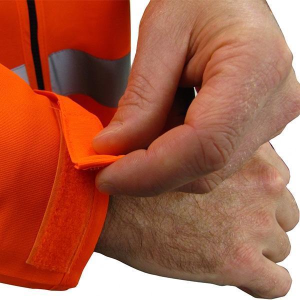 - High visibility vest in fluorescent orange with an extra-long tail and additional reflective tape.