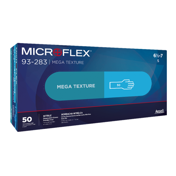 - Strong grip: Thanks to a Mega Texture surface, MICROFLEX 93-283 disposable gloves boast secure grip, for handling wet, oily, or fatty objects.