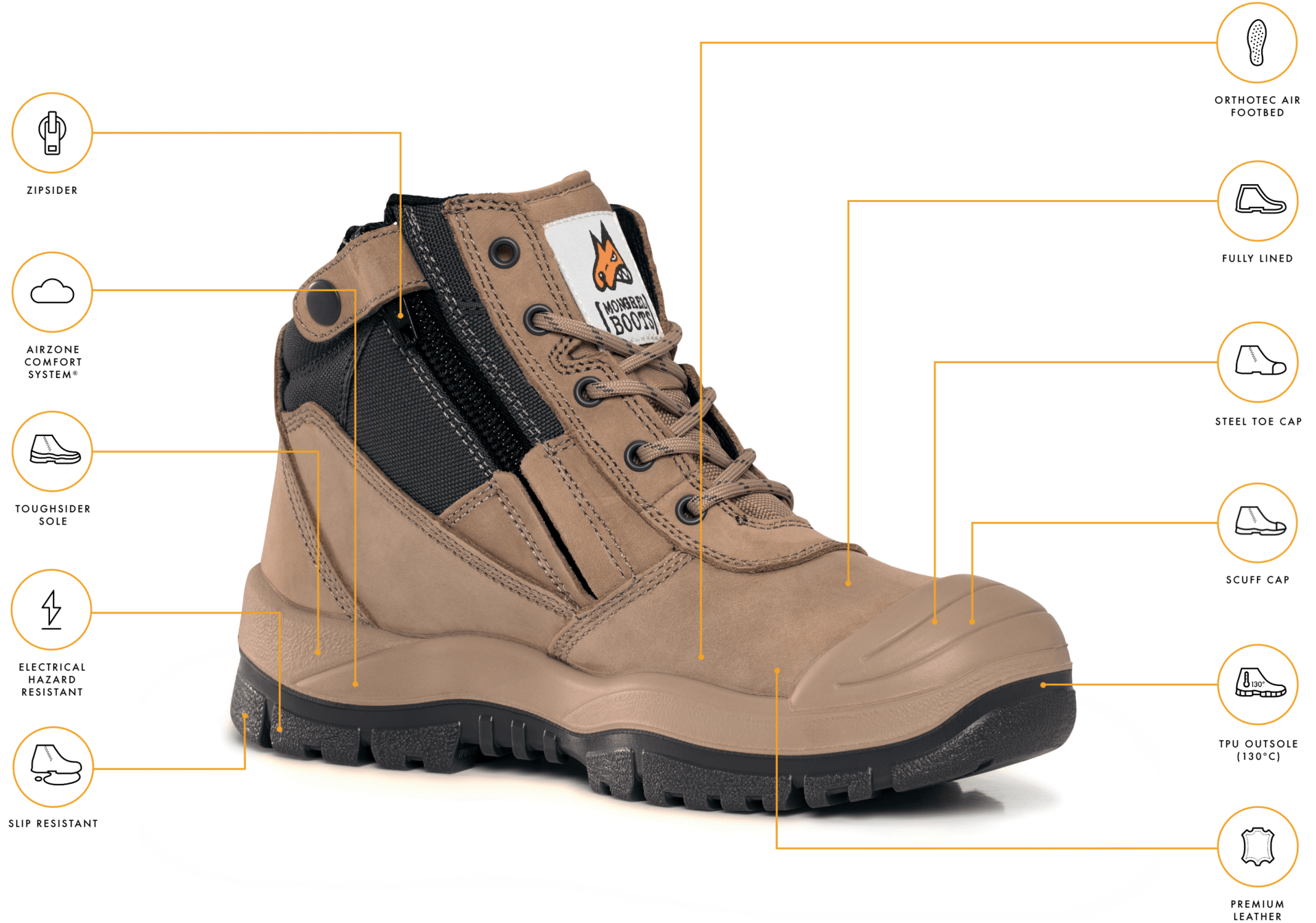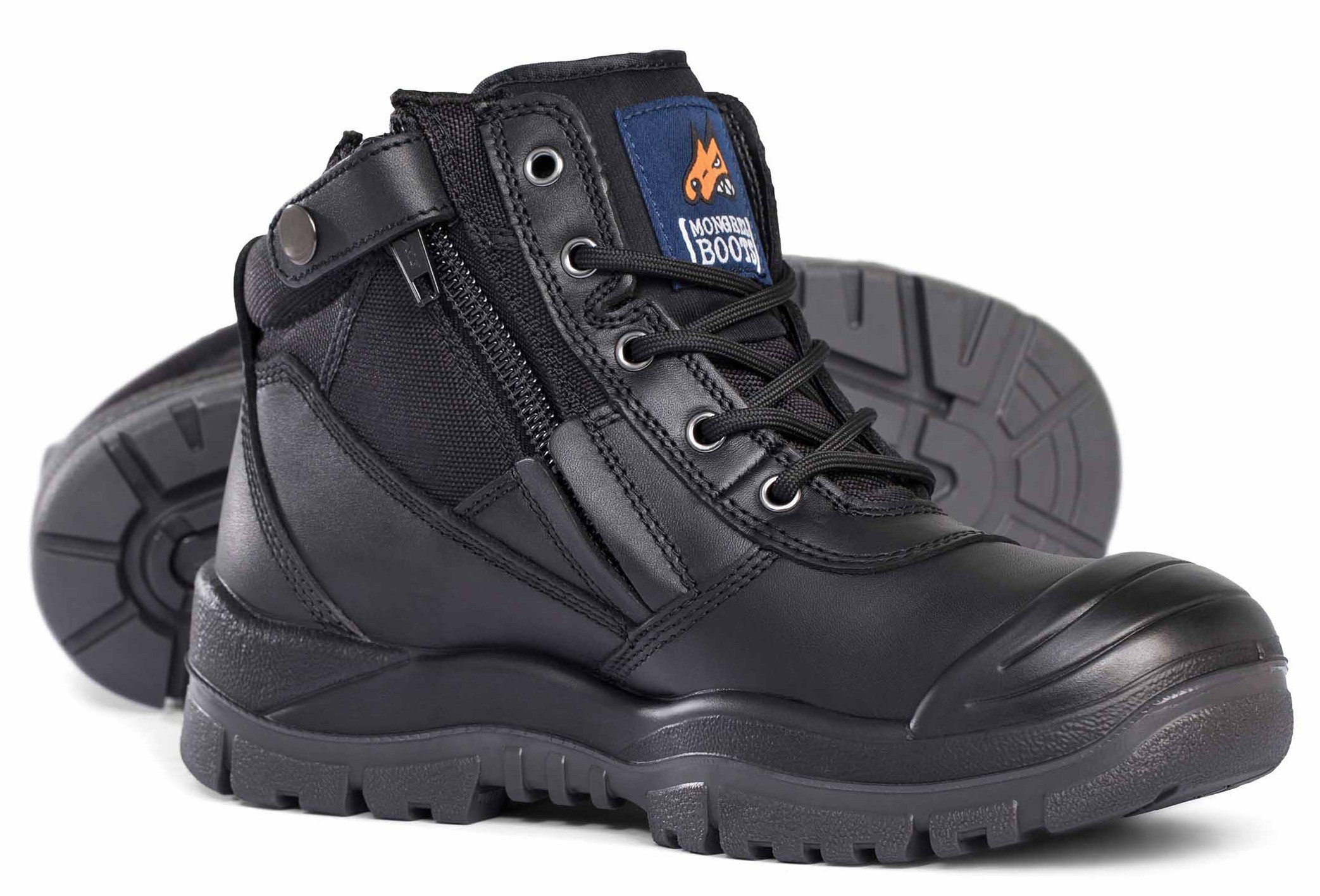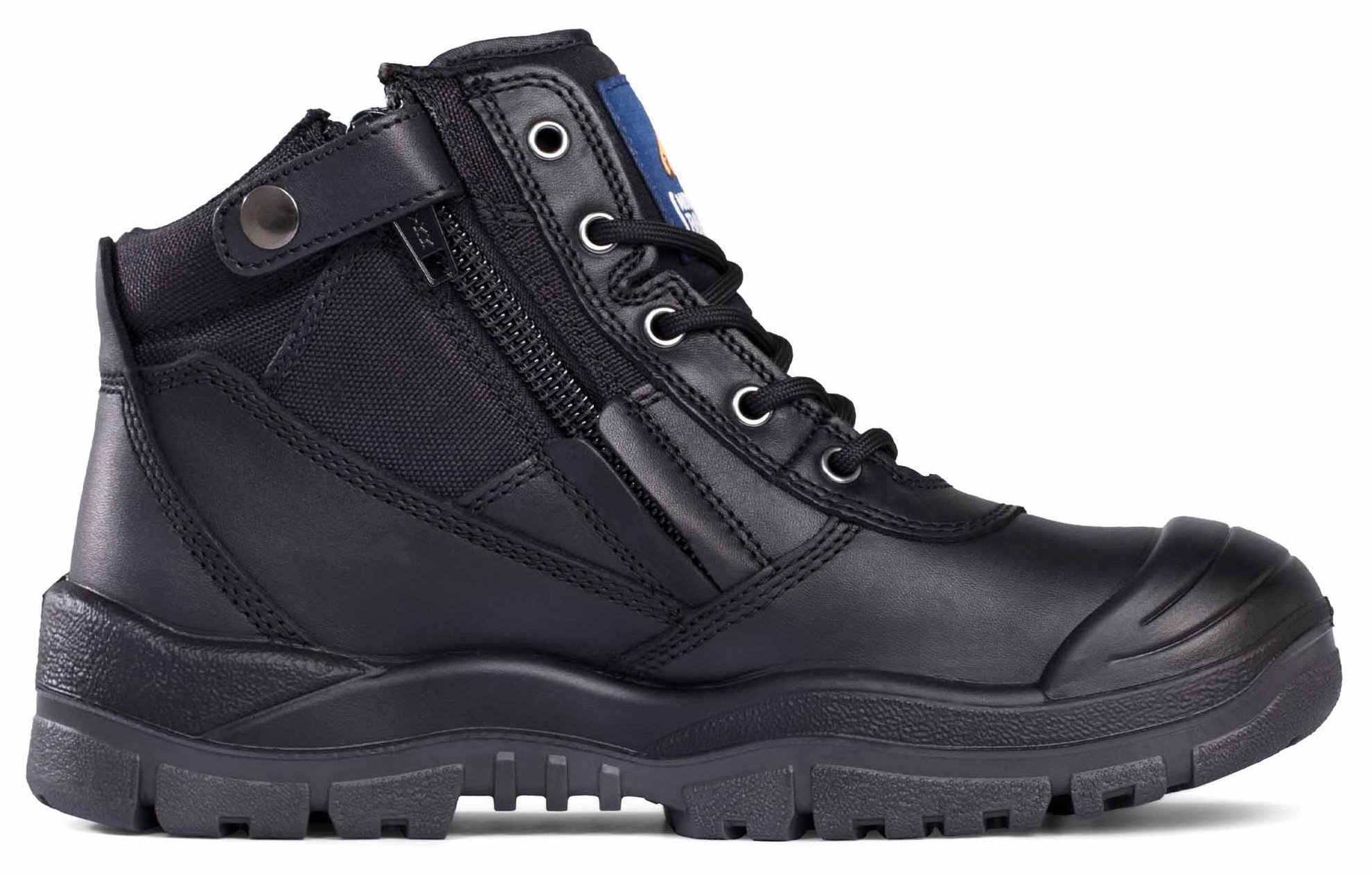- Mongrel ZipSider boot with anti-scuff front cap, black colour. Low ankle height provides flexibility and ease of movement; slipping in and out is effortless with the YKK zipper.